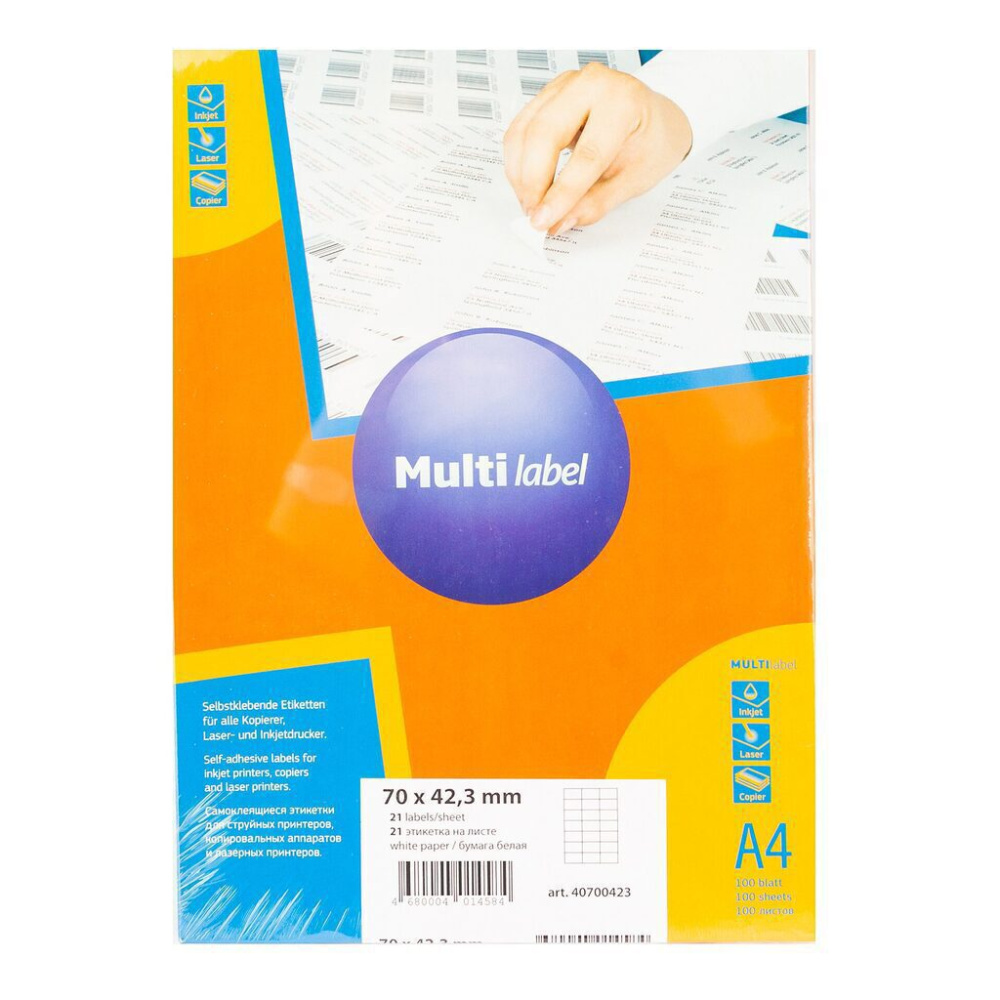 Универсальные этикетки А4 Multi Label производятся из белой бумаги, упакованы в пачки из жесткого картона по 100 листов. Этикетки Multi Label - это гарантия высокого качества печати на струйных и лазерных принтерах, а также на копировальных аппаратах. Для удобства в использовании лист имеет универсальную просечку на обратной стороне, что позволяет легко отделить этикетку от подложки. Самоклеящиеся этикетки позволят быстро и качественно подготовить адресные наклейки на конверты и товары, регистрационные номера, аннотации, штрих-коды, ценники, информационные тексты.