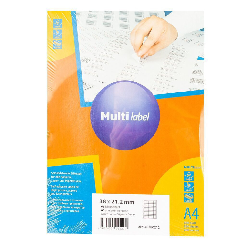 Универсальные этикетки А4 Multi Label производятся из белой бумаги, упакованы в пачки из жесткого картона по 100 листов. Этикетки Multi Label - это гарантия высокого качества печати на струйных и лазерных принтерах, а также на копировальных аппаратах. Для удобства в использовании лист имеет универсальную просечку на обратной стороне, что позволяет легко отделить этикетку от подложки. Самоклеящиеся этикетки позволят быстро и качественно подготовить адресные наклейки на конверты и товары, регистрационные номера, аннотации, штрих-коды, ценники, информационные тексты.