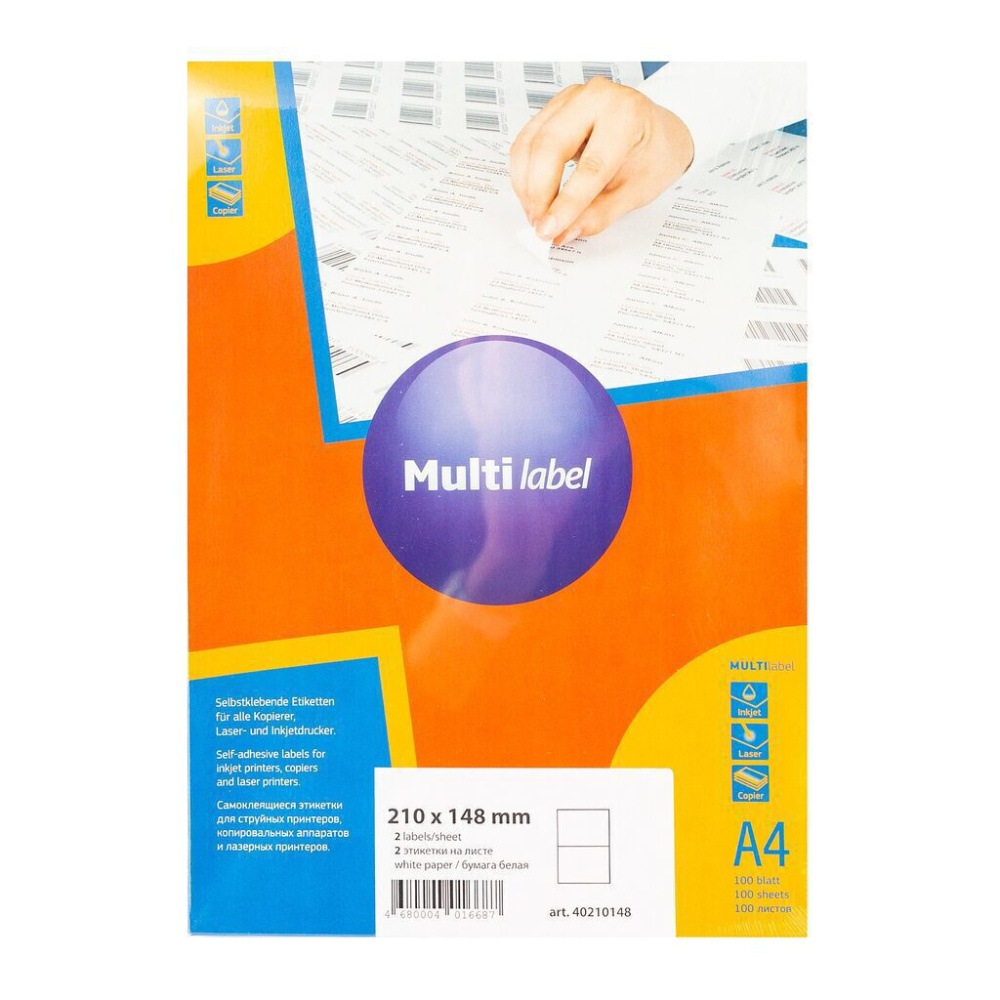 Универсальные этикетки А4 Multi Label производятся из белой бумаги, упакованы в пачки из жесткого картона по 100 листов. Этикетки Multi Label - это гарантия высокого качества печати на струйных и лазерных принтерах, а также на копировальных аппаратах. Для удобства в использовании лист имеет универсальную просечку на обратной стороне, что позволяет легко отделить этикетку от подложки. Самоклеящиеся этикетки позволят быстро и качественно подготовить адресные наклейки на конверты и товары, регистрационные номера, аннотации, штрих-коды, ценники, информационные тексты.