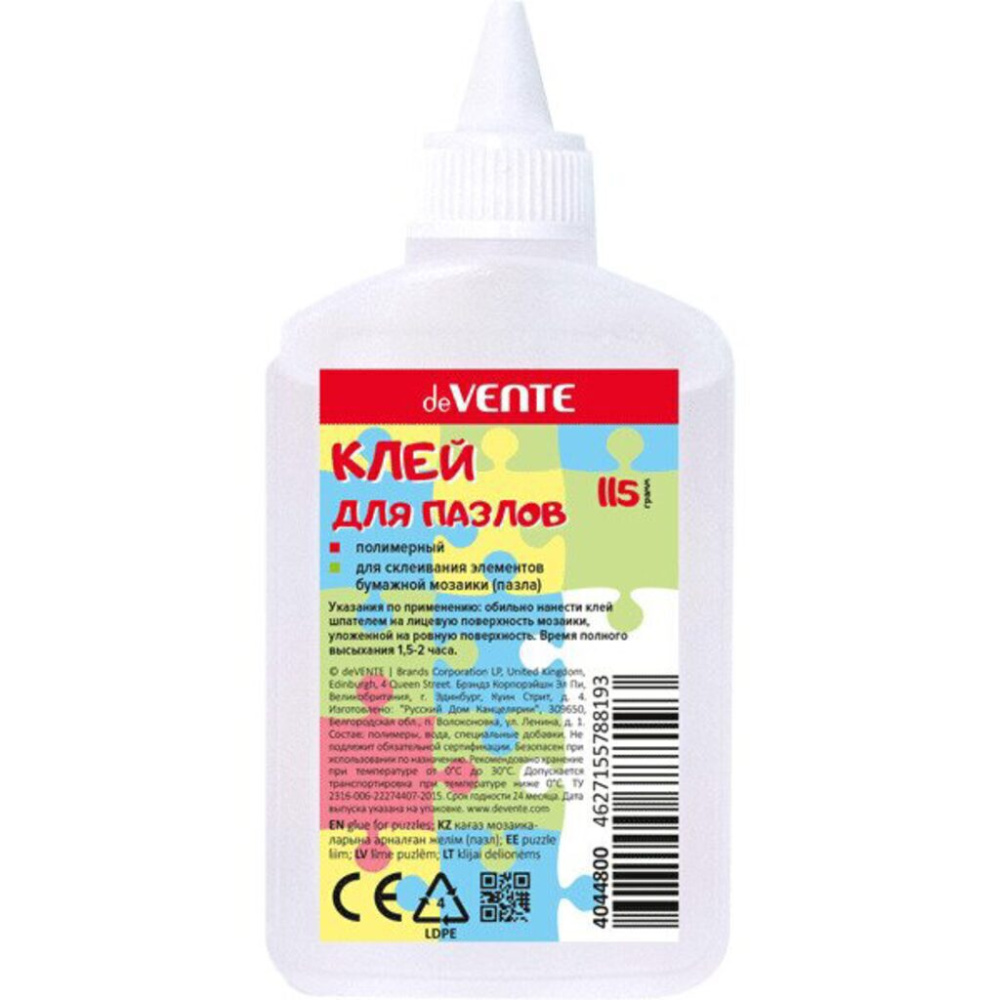 Клей Клей для склеивания пазлов, бумаги, картона "deVENTE" 115 г полимерный, в пластиковой бутылочке с дозатором и съемным колпачком евро. Как пользоваться клеем для пазлов: Положите пазл на твердую ровную поверхность без стыков, чтобы работа после нанесения клея не деформировалась. Используйте кисточку или картонный шпатель. На лицевую сторону небольшими порциями аккуратно наливайте клей в центр пазла. С помощью шпателя не спеша размажьте до краев. Осторожно - не наливайте клея слишком много за один раз. Если края некоторых кусочков намокли, не пугайтесь. После высыхания они вернутся в изначальный цвет. После этого дайте пазлу подсохнуть на 1,5 – 2,5 часа. И нанесите второй слой. После высыхания образуется тонкая прозрачная пленка, которая фиксирует пазл. Поверхность не блестит. Если во врем сборки вы случайно надорвали детали, они склеятся и станут ровными.
