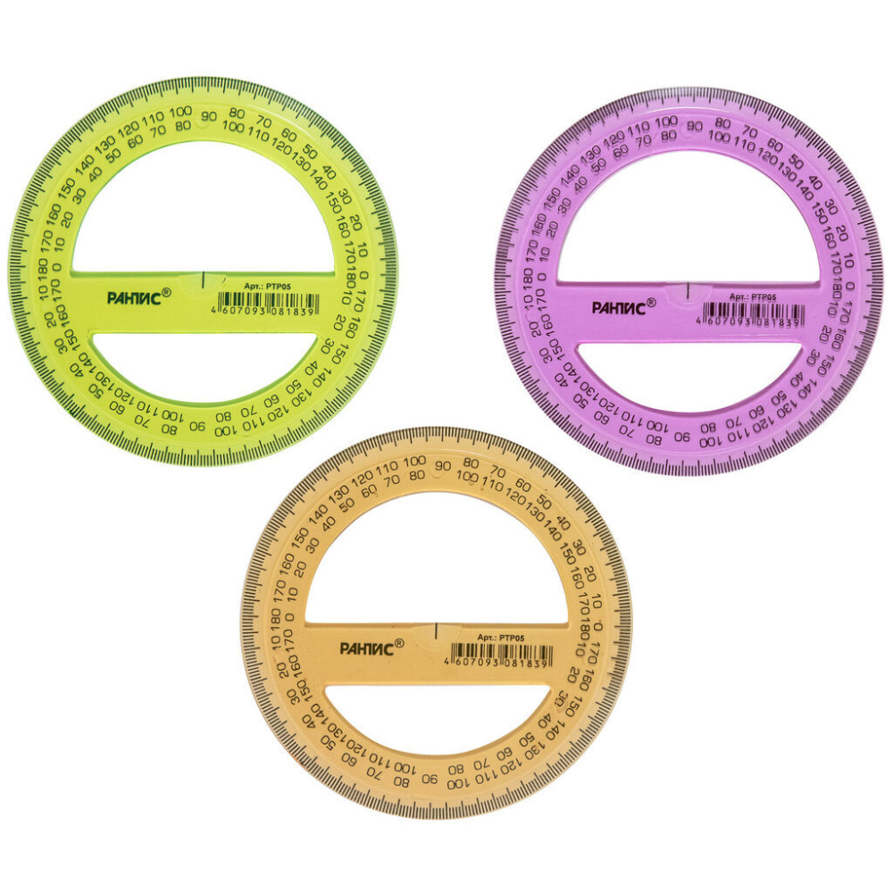 Транспортир 360 градусов 10 см, с чёткой отливной миллиметровой шкалой. Гладкая глянцевая поверхность. Цвет: яркие цвета ассорти (прозрачные). Штрих-код на единице изделия.