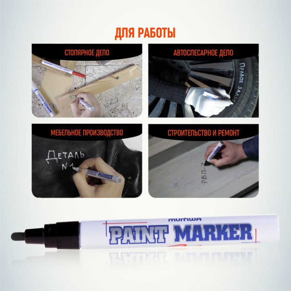 Paint Marker подходит для реставрации дефектов на бытовой технике, обуви, кузове автомобиля, а также надписей на каменных плитах. Маркер-краска MunHwa имеет широкое применения в дизайне, декорировании и оформлении.