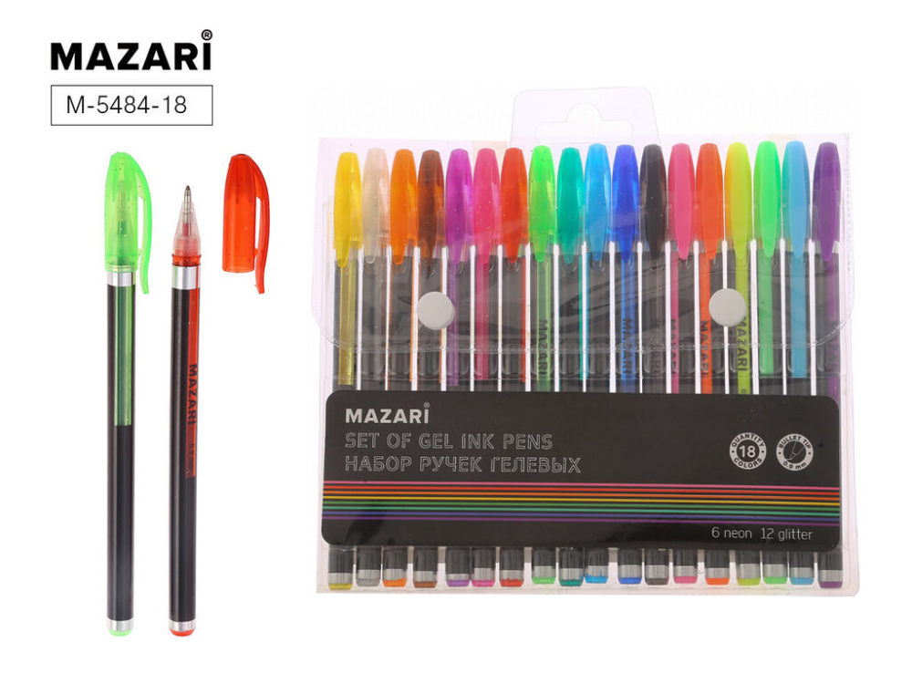 —Набор гелевых ручек MAZARI 18 цв. с блёстками аромат.чернила, цв.корпус, 0,8мм